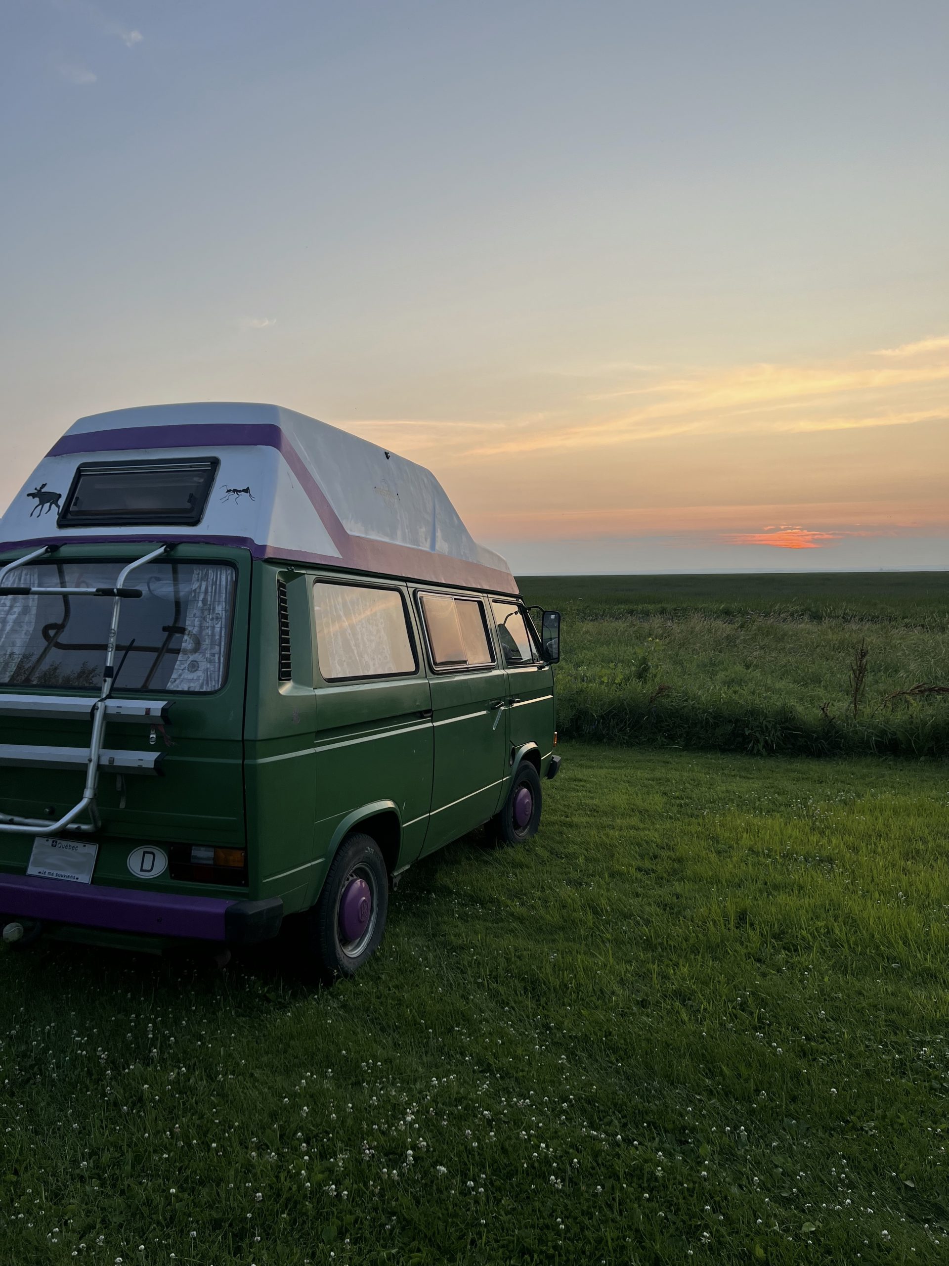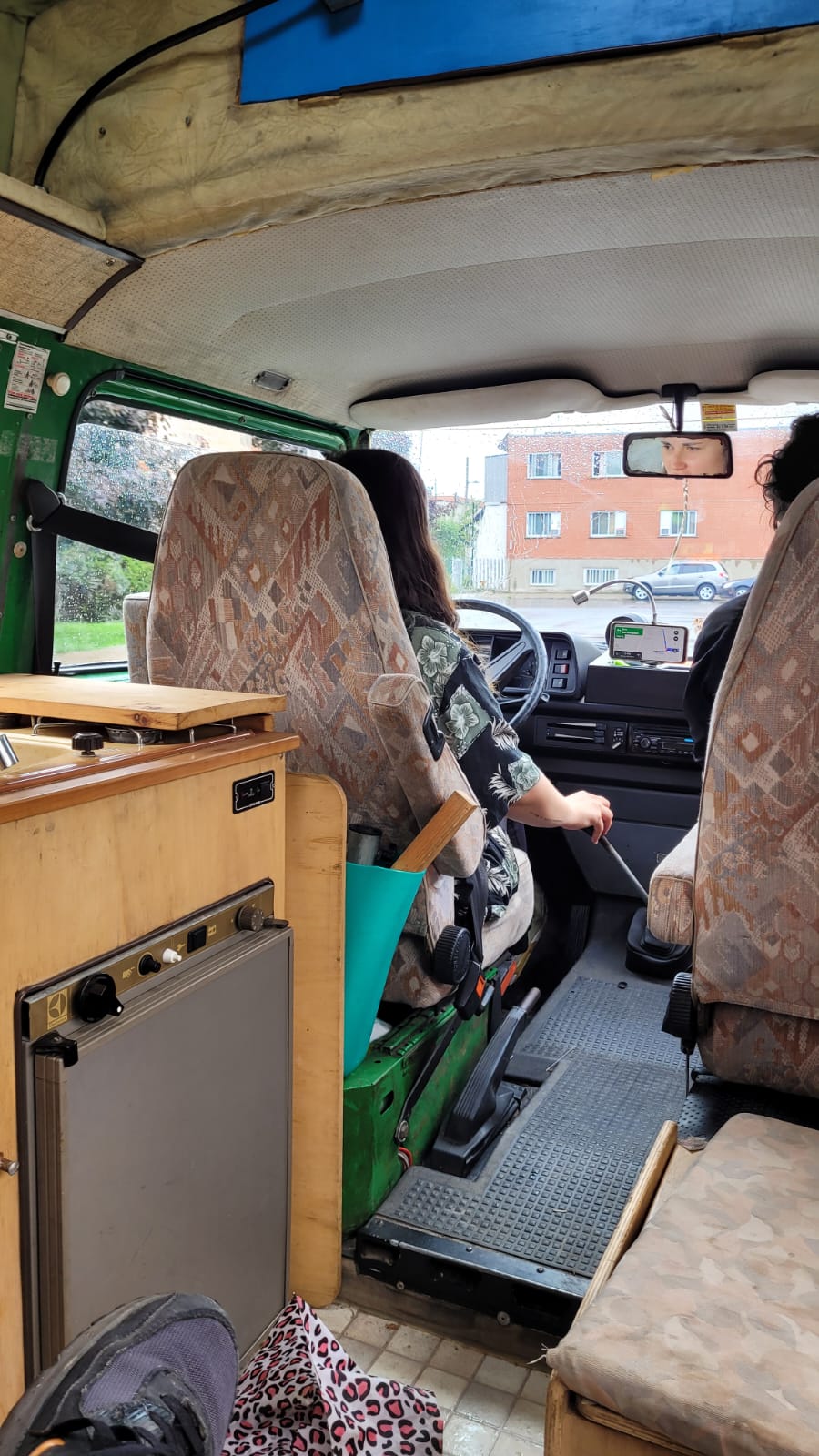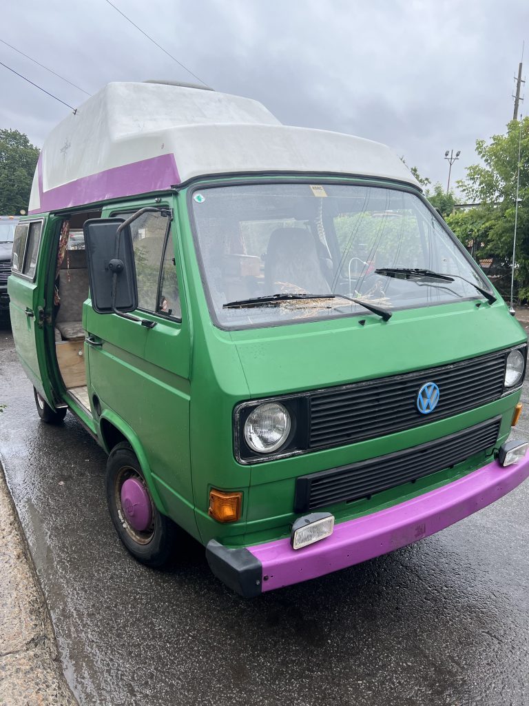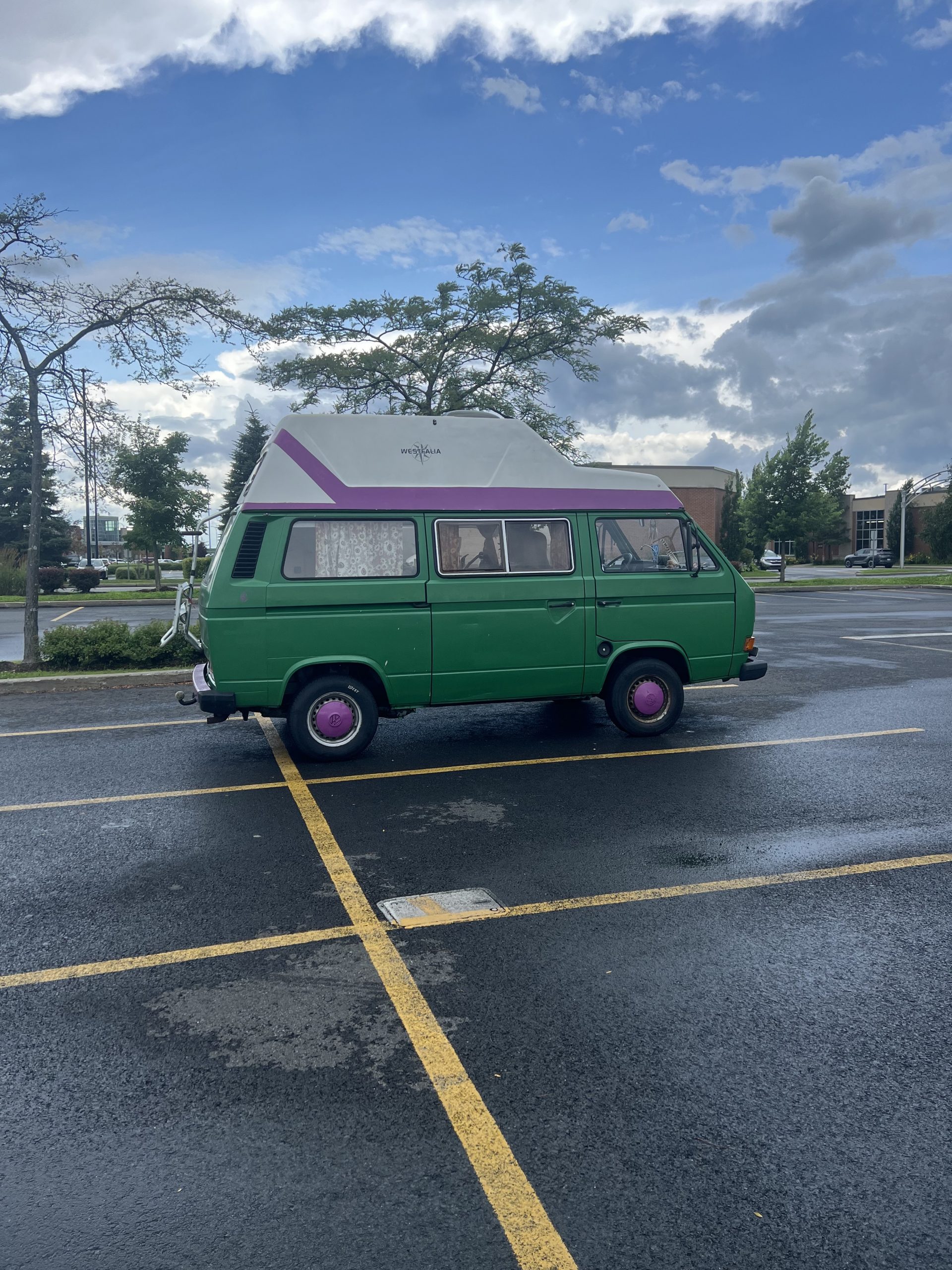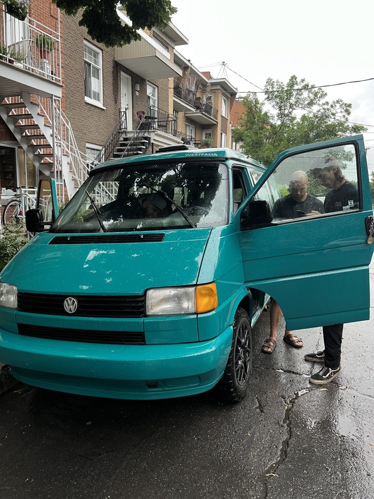 Ich kann es natürlich nicht lassen, schaue weiter nach Autos und finde einen T3 von 1983, dessen Motor 2019 komplett überholt wurde und der daher nur 100.000km runter hat. Am Donnerstag (13.07.) schauen wir uns den T3 an und sind ziemlich begeistert. Er hat im Gegensatz zum T4 ein festes Hochdach und einen richtigen Kühlschrank. Laury die Besitzerin erzählt, dass sie ihn vor zwei Jahren einem Deutschen abgekauft hat, der den T3 vorher nach Kanada importiert hatte. Daher hat er sogar noch den weiß-schwarzen „D“-Sticker hinten drauf, den „ADAC“-Sticker vorne und drinnen europäische Steckdosen. Das Interieur ist etwas abgerockter als der T4, dafür hat der T3 mehr Charme und auch eine tolle Außenfarbe: Grün mit lila. Zusammen mit Laury gehen wir in die Werkstatt, in der der T3 immer gewartet wurde und der Mechaniker erzählt uns, dass der Kühler und eine Dichtung getauscht werden müsste, das würde so 500$ kosten, ansonsten ist das Auto aber im super Zustand („C’est un bon achat.“ – „Es ist ein guter Kauf.“ – er spricht nämlich nur französisch). Da wir noch Geld in das Auto investieren müssen, geht Laury mit dem Kaufpreis runter und der T3 wäre sogar 1000$ günstiger als der T4. Puh okay, nun sind unsere Köpfe völlig am Durchdrehen und wir können uns zwischen dem T4 und dem T3 nicht entscheiden. Wir wissen zwar, dass diese Autos hier drüben seltener sind und daher auch die Teile schwieriger zu bekommen, aber wir finden sie trotzdem ziemlich gut.