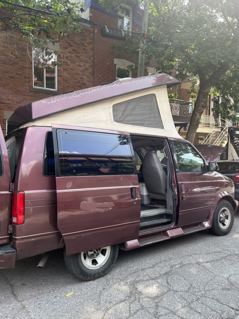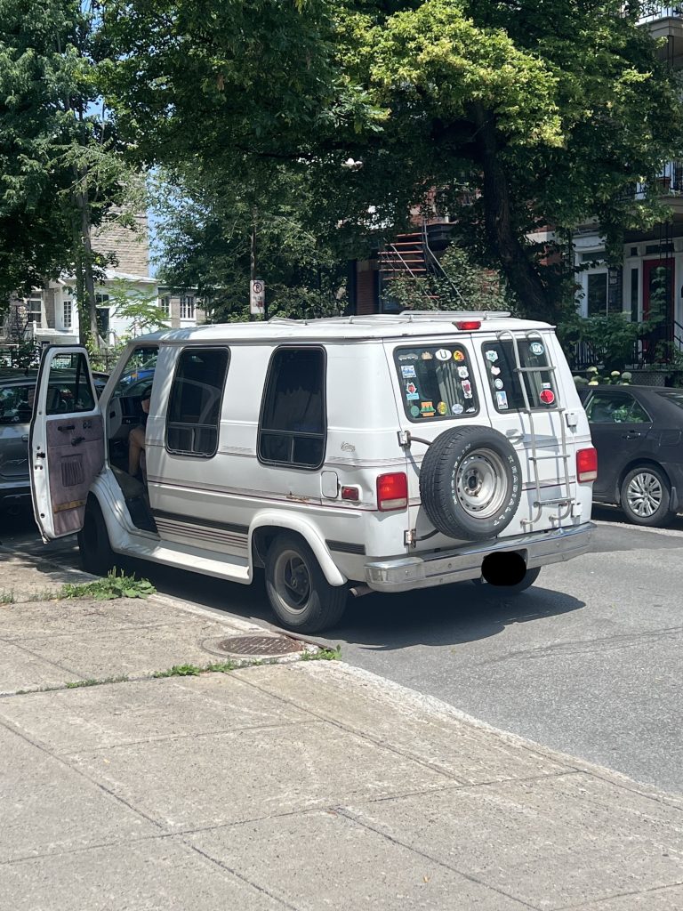 Zwei Tage später am Dienstag (04.07.) finden wir ein passendes Auto für uns. Es ist ein GMC Safari Condo, also ein amerikanisches Auto mit einem Motor, von denen es viele hier gibt, und das zu einem Campervan umgebaut wurde, so ähnlich wie ein VW-Bus. Es ist ein relativ kleines Auto, aber mit einem Längsbett (wichtig für den großen Malte), noch einem weiteren Bett oben, einem Aufstelldach, 4 Anschnallgurten (wir können noch Leute mitnehmen), einem Porta Potti (für alle Nicht-Camper: eine mobile, kleine Toilette mit Schüssel, Spülwassertank und Fäkalientank), einer kleinen Kühlbox, die man auf weniger als 10 Grad Außentemperatur runterkühlen kann und einem Fahrradträger mit einem Rad. Clément, der Besitzer, ein Franzose, der seit längerem in Montréal lebt, möchte sich demnächst ein Haus kaufen und benötigt das Auto nicht mehr. Wir sind begeistert von seinem Auto, handeln etwas den Preis runter und schlagen mit ihm ein. Er will sich um einen Inspektionstermin in der Werkstatt kümmern, das wird laut ihm, aber wohl erst nächste Woche was, weil der Mechaniker zur Zeit im Urlaub ist. Wir sagen, wir klären den Kram mit der Versicherung und schauen, wie wir das Geld auf unserer kanadisches Bankkonto bekommen und bleiben in Kontakt. Wir freuen uns sehr und machen uns direkt auf den Weg, um nach einer Autoversicherung zu schauen. Während wir in einem Einkaufszentrum frühstücken, fängt es ziemlich stark an zu regnen, also sitzen wir erstmal fest. In dem Zentrum gibt es jedoch die Bank „Desjardins“, die auch Versicherungen anbietet. Wir fragen vorne am Empfang, ob wir hier richtig für eine Autoversicherung sind und die Dame führt uns direkt nach hinten zu den Büros. Wir denken noch, „krass, dass wir hier jetzt einfach so ohne Termin direkt drankommen“, als sie uns in ein Büro führt und uns bittet Platz zu nehmen. Dann nimmt sie jedoch den Telefonhörer in die Hand, wählt eine Nummer und drückt uns das Telefon in die Hand, damit wir mit der Hotline telefonieren können. Aha, so funktioniert das hier also.