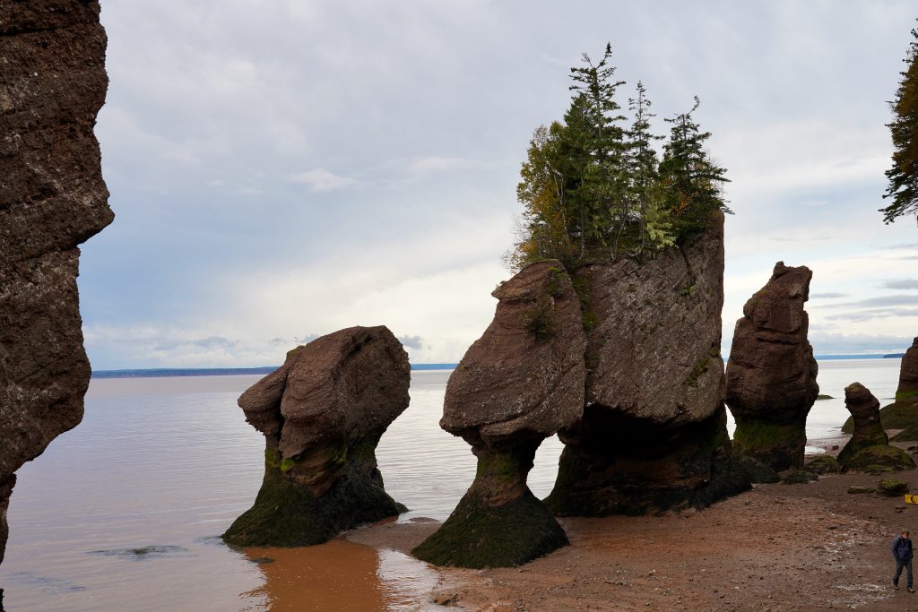 Da es noch den ein oder anderen Ort gibt, den wir uns auf der Strecke angucken wollen, fahren wir nicht einfach stumpf durch. Naja noch nicht. Unser erstes Ziel auf der Reise gen Westen sind die „Hopewell Rocks“. Ein Küstenabschnitt in New Brunswick (und u.a. hier zeigt sich endlich auch mal die schöne Seite von New Brunswick) in dem es den höchsten Tidenhub der Welt zu bestaunen gibt. Die Hopewell Rocks sind Felsen, die man bei Ebbe dort vom Strand aus bestaunen kann und bei Flut sind sie meterhoch vom Wasser verdeckt. Eindrucksvolle Felsen, da die Gezeiten das Gestein mit der Zeit immer weiter abgetragen haben und somit ein dünner Hals entsteht, auf dem oben dann die dicken Felsen sitzen, die aus dem Wasser rausgucken.