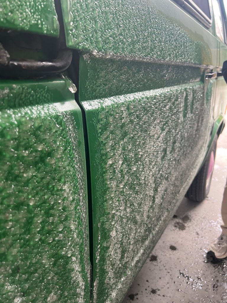 Heute ist es dann also so weit. Der Teil der Strecke, der uns schon seit Wochen gedanklich begleitet, steht heute an. Wir haben heute früh -1°C und einen feinen Nieselregen. Super, immerhin kein Schnee und wenn es noch ein bisschen wärmer wird im Laufe des Tages, sind wir ja im Plusbereich. Das scheinen erst mal gute Voraussetzungen sein, um heute den ersten Teil über die Rocky Mountains zu fahren. Dachten wir…… Der feine Nieselregen verwandelt sich, durch den Fahrtwind, schnell in einen Eispanzer. Nach kurzer Zeit müssen wir einen Tankstopp einlegen und ich versuche Mausi vom Eis zu befreien. Eine dicke Eisschicht liegt über der gesamten Front. Vor allem die Scheibenwischer machen uns Probleme. Die Gummis frieren ein, verwandeln sich in eine Eisstange und das gewischte Sichtfenster wird minütlich immer kleiner. Das heißt wohl jetzt, regelmäßig, so alle halbe Std., anhalten, die Scheibenwischer vom Eis befreien und weiterfahren. Und an alle Schlauköpfe da draußen, nein das Wischwasser mit Frostschutzmittel hat auch nicht geholfen.