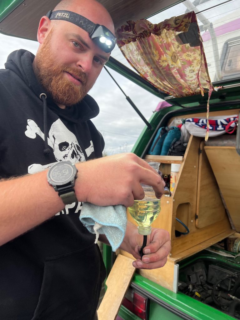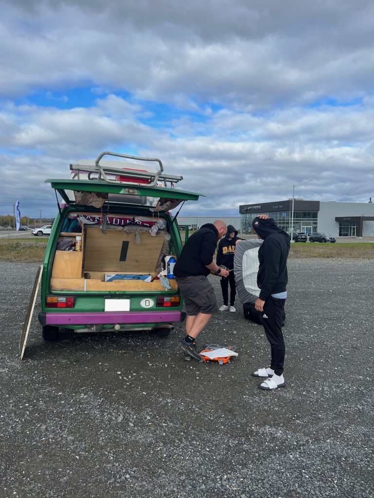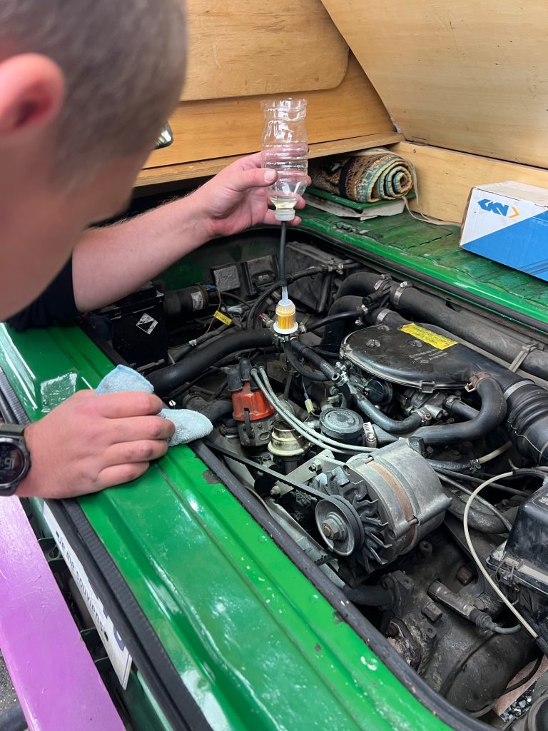 Wir kommen durch Grand Falls, einer Kleinstadt direkt an der US-Grenze. Eigentlich gibt es in dieser Stadt überhaupt nichts Spektakuläres (außer vielleicht irgendwelche namensgebende großen Wasserfälle), aber für uns soll wohl auch Grand Falls noch lange in Erinnerung bleiben. Wir müssen tanken. Fahren runter vom Highway zur Tankstelle, tanken, essen und fahren weiter. Naja zu mindestens so 200m. Gleiches Problem wie bei der Werkstatt. Auto nimmt kein Gas mehr an, Auto geht aus, Auto geht nicht wieder an. Kacke. Und nun? Natürlich regnet es und es ist kalt, weil es sonst viel zu einfach wäre. Wir räumen die Motorhaube frei (denn die Motorhaube liegt schließlich unter unserem Bett, unter der Matratze, unter dem Gepäck von den Jungs) und ich mache mich ans Werk. Was könnte das Problem sein. Ich sehe, dass der Benzinfilter leer ist. Das heißt, dass der Motor anscheinend schon wieder kein Sprit bekommt. Zum Glück war ich bei der ganzen Aktion, ein paar Tage vorher, in der Werkstatt dabei und wusste so bisschen was der Mechaniker in diesem Fall gemacht hat. Er hat letztendlich das Benzin manuell durch die Benzinpumpe aus dem Tank gezogen und dann lief es wieder. Problem ist, wir haben nichts, womit ich das Benzin ansaugen kann. Also versuchen wir was anderes. Lara googelt in der Zwischenzeit und recherchiert. Irgendwo findet sie die Info, dass die Schwimmerkammer des Vergasers leer sein könnte und somit kein Sprit mehr ankommt. Also heißt es für mich, eine OP am offenen Herzen. Vergaser aufschrauben. Zum Üben schnappe ich mir, unseren vorhin erwähnten, alten Vergaser. Als ich herausfinde, wie ich an die Schwimmerkammer komme, mache ich mich an unseren eigentlichen Vergaser. Da, endlich, ich bin an der Schwimmerkammer angekommen und sie ist tatsächlich leer. Aber wie zur Hölle bekomme ich da nun das Benzin rein. Kurzerhand bastele ich mir aus einer kleinen Plastikflasche und einem kleinen Schlauch vom alten Vergaser eine Art Trichter. So konnte ich die Schwimmerkammer wieder auffüllen. Um sicher zu gehen, versuchen wir auch noch alle Zuleitungen und den Benzinfilter manuell mit meinem Trichter zu befüllen. Ich starte den Motor und er läuft. Kurz. Dann geht er wieder aus. Scheiße. Der Motor hat einfach den Sprit, den ich ihm manuell gegeben habe, verbrannt, aber es kam immer noch kein neuer Sprit an. Was nun? Es wird immer später, nasser, kälter und ungemütlicher. Wir vier sind ein super Team. Lara recherchiert, ich bastele rum und die Jungs stehen mir beiseite und helfen mir. Immer wieder bringen sie echt gute Anmerkungen und ich bin in diesem Moment einfach froh, dass sie dabei sind, denn sie sind eine gute Stütze, vor allem mental. Gleichzeit habe ich ein schlechtes Gewissen, dass sie jetzt wegen uns hier in so einem kleinen Scheißkaff festsitzen. Aber gut, die Risiken hatten wir ihnen ja klar und deutlich kommuniziert. Trotzdem bleibt das schlechte Gewissen. Was man noch zu der ganzen Situation erwähnen muss, ist, dass es ein Samstagnachmittag ist. Was bedeutet, dass sowohl heute als auch morgen alle Werkstätten geschlossen haben. Großartig, da bleibt man schon zu mindestens in so einer Kleinstadt liegen und nicht mitten im Nichts, aber dann ausgerechnet an einem Wochenende. Achja und wo wir standen? Auf einem großen Schotterplatz zwischen dem Highway und der Straße die von der Tankstelle in die Stadt reinführt. Um uns herum nur ein Hotel und ein paar Autohäuser (die natürlich auch geschlossen waren). Also keine Hilfe weit und breit. Wir telefonieren auch noch mit der CAA (dem kanadischen ADAC) und erfahren, dass die uns bestenfalls bis zu 160km abschleppen können. Aber wohin? Zu irgendeiner geschlossenen Werkstatt, die uns am Montag dann sagen „Sorry but we don`t schrauben on solche alten german cars here!“? Also auch keine Option. Mir viel ein, dass es im Autoteilezubehör eine Art Handpumpe gibt, mit der man Flüssigkeiten aus einem Tank herausziehen kann. Da es in Grand Falls einen Canadian Tire gibt (das kanadische ATU und ungefähr in jedem kleinen Dorf vorhanden) gucke ich online ob die so eine Pumpe vor Ort haben. Und das haben sie. Gut, aber wie kommen wir dahin? Zu Fuß? Das dauert über eine Stunde für eine Strecke. Lara kommt auf die Idee zu trampen. Es muss doch jemanden geben, der in die Richtung fährt und die Kanadier sind ja schließlich alle so nett und freundlich und hilfsbereit. Nope. Sind sie nicht. Zu mindestens nicht in Grand Falls. Eine Stunde lang probieren wir es, aber werden bestenfalls komisch angeguckt. Nagut, also Taxi. Long Story short. Nachdem Lara endlich mal ein Taxiunternehmen gefunden hat, was ans Telefon gegangen ist oder wo man überhaupt durchkommt und die Nummer stimmt, werden wir von einer vermeintlich betrunkenen Taxifahrerin in ihrem Privatauto zu Canadian Tire gefahren. Auf dem Weg dahin, muss sie dann nochmal eine Freundin aufsammeln, die dann mit uns im Auto sitzt und die ganze Zeit laut telefoniert, in einer Sprache, dessen Worte französisch klingen aber vom Tonfall eher an arabisch erinnern. Naja egal, Hauptsache wir haben das Teil und sie fährt uns zurück zu Mausi. Mittlerweile ist es komplett dunkel und die Jungs sind schon halb erfroren, da sie die ganze Zeit im Van warten mussten. Mit Stirnlampe geht es wieder ans Werk und ich ziehe das Benzin nun mit der Pumpe, bzw. eher übergroßen Spritze, manuell durch die Benzinpumpe. Alles wieder zusammenstecken und Motor anschmeißen. Er springt an und läuft. Und läuft. Ich sitze vorne auf dem Fahrersitz und höre die euphorischen Rufe von den anderen drein „Es läuft, es läuft, es läuft“. Was sie damit meinen, ist, dass das Benzin in den Benzinfilter läuft. Das bedeutet der Motor zieht wieder Sprit. Und ja, der Motor geht nicht wieder aus. Ich kann es kaum glauben. Wir Vier haben das Problem tatsächlich ganz allein gelöst. Das fühlt sich schon verdammt gut an und ein gewisser Stolz macht sich breit. Dann, als hätten wir es geplant, ein F