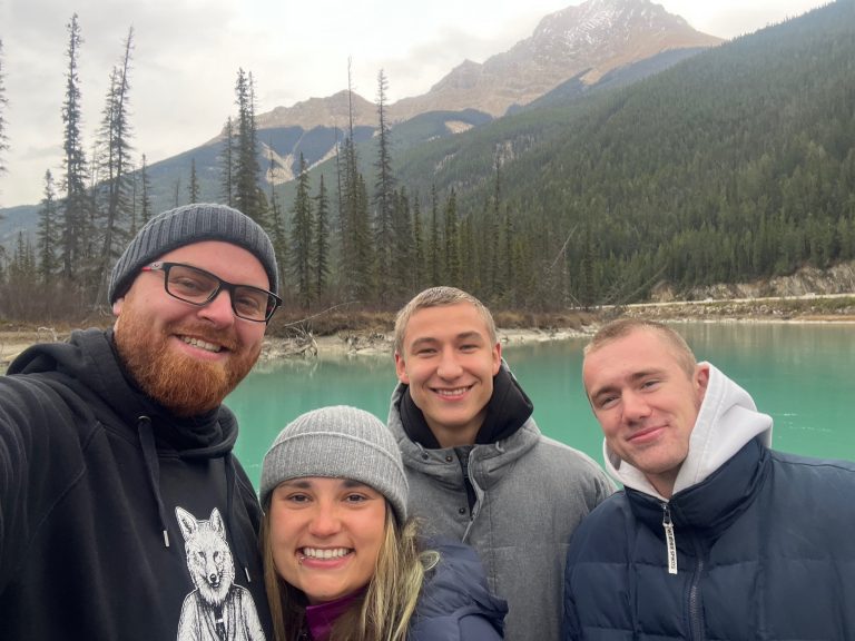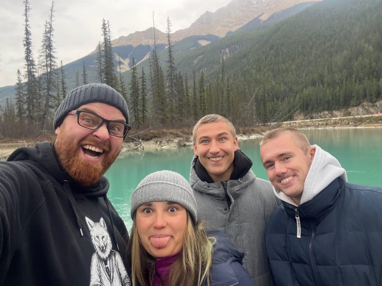 Da die angesagten Temperaturen für Golden nun in der Nacht auch wieder tiefer sein sollen, entscheiden wir uns erneut für eine Unterkunft. Nach kurzer Recherche findet Lara eine traumhafte Bleibe für die Nacht. Die Basecamp Lodge in Golden. Ein riesige Blockhütte, die für uns ein kleiner kanadischer Traum ist. Wir buchen uns ein Vierbettzimmer und sitzen abends gemeinsam auf riesigen kuscheligen Sofas am offenen Kamin im Foyer. Draußen schneit es mittlerweile immer doller, aber wir machen uns darüber keine Gedanken. Wir genießen einfach den Abend und freuen uns eher darüber, dass der Schnee, den wir aus der großen Glasfront beobachten können, ein Kanada typisches Bild malt, wie wir uns es nie hätten vorstellen können. Es geht an diesem Abend, ungeplant, ein kleiner Traum in Erfüllung. Ich merke, dass ich alle Sorgen von mir abfallen lassen kann und denke mir eher, dass wenn wir hier eingeschneit werden, wir halt noch ein paar Tage hierbleiben. Wäre doch eigentlich ganz schön.