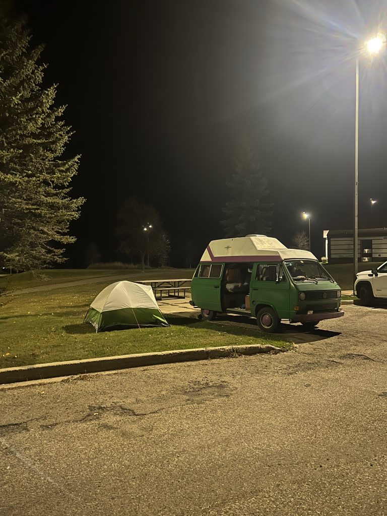 Und dann spät abends, nach fast 1.000 km und 14 Stunden Autofahrt, bleiben wir 160 km vor Calgary auf einmal stehen. Neeiin, keine Panik. Wir bleiben nur stehen, um die Nacht auf einem Rastplatz direkt am Highway zu verbringen. Mausi macht bis jetzt alles wunderbar mit. War die Sorge vielleicht ganz umsonst? Naja noch sind wir nicht da und der schlimmste Teil wartet noch auf uns. Aber was war das für ein Ritt heute?! Uns allen tut der Hintern weh und wir sind froh, dass wir uns nun endlich hinlegen können. Die Temperaturen sollen in der Nacht nicht unter den Gefrierpunkt gehen. Schon mal gut…