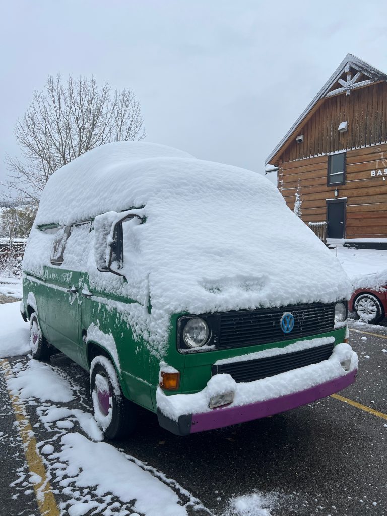 Und ja, am nächsten Morgen liegen ca. 20 cm Neuschnee. Mausi ist bedeckt mit einer dicken Schneeschicht und die Straßen sind teilweise noch nicht geräumt. Gut, dass wir gestern in Banff noch Türschlossenteiser gekauft haben, denn sonst wäre Mausi heute wohl zu geblieben. Krass, denn immerhin haben wir Ende Oktober. Der Rezeptionist erzählt uns dann auch, dass so viel Schnee, selbst hier, so früh sehr außergewöhnlich ist. Egal, denken wir uns. Wir wollen weiter.