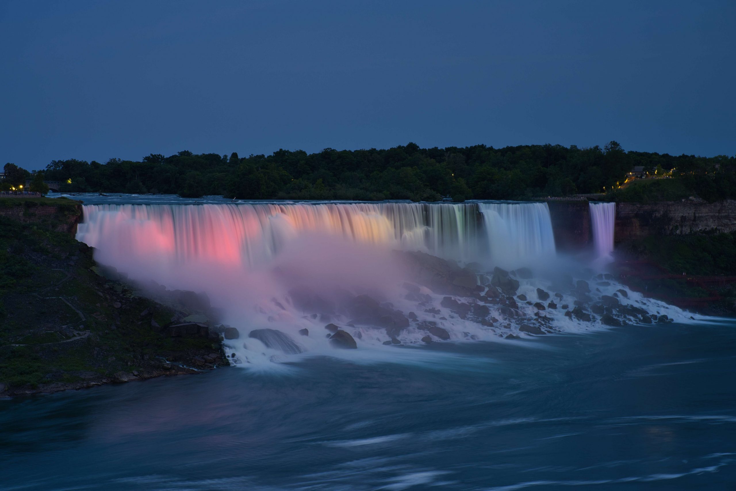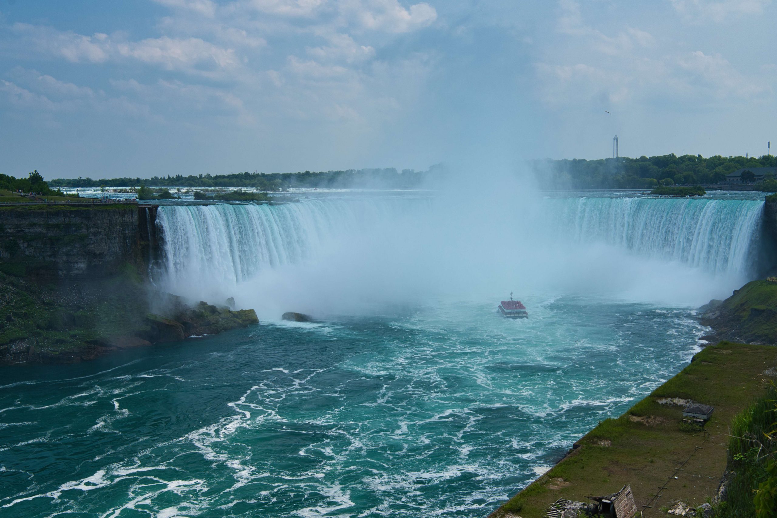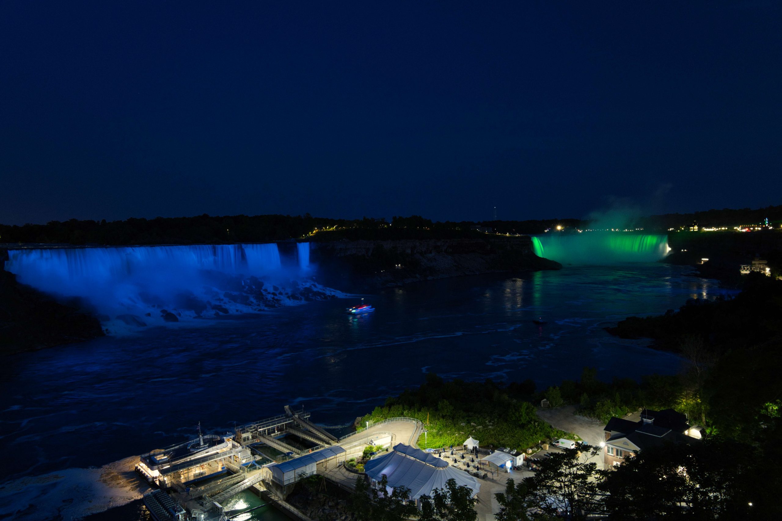 Update von Lara zum Ausflug zu den Niagara Falls: Etwa 140km von Toronto entfernt liegen die Niagara Wasserfälle. Über einen Facebook-Beitrag in einer Work and Travel Kanada Gruppe haben wir uns mit ein paar anderen Reisenden vernetzt, um zusammen einen Ausflug zu den Wasserfällen zu machen. Marshal und Manou, ein deutsches Paar, was bereits seit Oktober 2022 in Kanada unterwegs ist, haben ein großes Motorhome, mit dem wir netterweise zusammen zu den Wasserfällen hinfahren können. Jakob, der etwas außerhalb von Toronto wohnt, ist auch gerade für ein paar Monate in Kanada, um sein Englisch aufzubessern, bevor er mit dem Studieren beginnt. Und Yvan, unser Zimmernachbar, ein Franzose, der seit einem Jahr in Montréal wohnt und für ein paar Tage in Toronto ist, um ebenfalls sein Englisch aufzubessern, ist auch mit dabei. Da Marshal mit dem Motorhome nur so 75km/h fährt, damit es nicht ganz so viel Benzin schluckt, brauchen wir statt 2 knapp über 3 Stunden. Aber das ist völlig in Ordnung, denn wir sitzen ganz gemütlich hinten im Wohnmobil zwischen all dem schönen Feder- und Steinschmuck, den Manou gebastelt hat, und genießen die Aussicht. Wir parken auf einem großen Parkplatz und machen uns auf den Weg zu den Falls. Angekommen sind Malte und ich tatsächlich als erstes etwas enttäuscht und denken so „Okay, das sind also diese berühmten Wasserfälle. Haben wir uns irgendwie größer vorgestellt.“ Es sind sehr viele Tourist*innen auf dem Gehweh unterwegs und die Boote, die ganz nah an die Wasserfälle ran fahren, sind auch super voll. Alle haben Regenponchos an, auf den Booten aus der USA blaue Ponchos, auf den Booten aus Kanada rote – es wird hier also ganz deutlich gemacht, wer aus welchem Land kommt. Wir haben keine Lust viel Geld zu bezahlen, um mit einem Boot einmal kurz ranzufahren und nass zu werden. Wir spazieren also Richtung einem Wasserfall und beobachten einen Vogel dabei, wie er am Abgrund verschwindet und hoffen, dass ihm nichts passiert ist. Je weiter wir gehen, desto weniger Menschen werden es und es wird entspannter. Wir finden einen großen Baum, dessen Äste eine Höhle bilden, in die man reingehen kann und betrachten die Schnitzereien auf der Rinde. Da es irgendwann nicht mehr so richtig weitergeht, drehen wir wieder um und gehen den Weg zurück und Richtung anderem Wasserfall. Als wir langsam Hunger bekommen, holen wir uns in einem kleinen Foodcourt was zu essen. Das Essen ist hier teuer und leider gibt es nur Fast Food Kram, alles sehr touristisch aufgezogen. Danach chillen wir uns in einen Park und beobachten das Wasser. Wir wollen noch bleiben, bis es dunkel wird, weil Marshal von einer Lichtershow um 20 Uhr gelesen hat. Leider ist um 20 Uhr noch nicht wirklich was zu sehen, es ist allerdings auch noch relativ hell. Wir setzen uns auf eine Mauer und quatschen, um uns die Zeit zu vertreiben. Gegen kurz nach 21 Uhr sind dann die ersten Lichter bei den Wasserfällen zu sehen und es sieht super schön aus. Wir suchen uns einen besseren Platz zum Sehen und beobachten, wie der Wasserfall in Regenbogenfarben leuchtet (Juni ist in Nordamerika der Pride-Monat). Ganz am Ende gibt es noch ein kurzes Feuerwerk, was man sich auch hätte sparen können. Wir machen uns auf den Weg zurück und gehen dabei noch durch eine Straße mit viel leuchtender Reklame, einigen Fast Food Läden und so Spielbuden wie auf dem Rummel, bloß in größer, einem Riesenrad Adventure Mini-Golf etc. – es fühlt sich an wie Klein Las Vegas und wir sind froh, als wir da durch sind und es etwas ruhiger ist. Auf einer Wiese sehen wir noch ein paar Füchse rumlaufen und dann sind wir auch schon wieder am Wohnmobil angekommen. Mit guter Musik machen wir uns auf den Weg nach Hause und Marshal bringt uns wieder wohlbehalten zurück nach Toronto, während wir alle hinten sitzen und schlafen. Dies war ein echt super schöner Ausflug und wir sind froh, dass man auf Reisen Dinge macht, die einem zu Hause nicht mal einfallen würden. Wir verabreden uns einfach mit fremden Menschen über Facebook, steigen bei ihnen mit noch anderen fremden Menschen ins Auto und machen alle gemeinsam einen Ausflug. Wir sind eine zusammengewürfelte Truppe von Menschen, die zusammen etwas erlebt und direkt fühlt man sich verbunden, obwohl man sich nur ein paar Stunden kennt. Und genau, das ist der Grund, warum wir unterwegs sind.