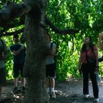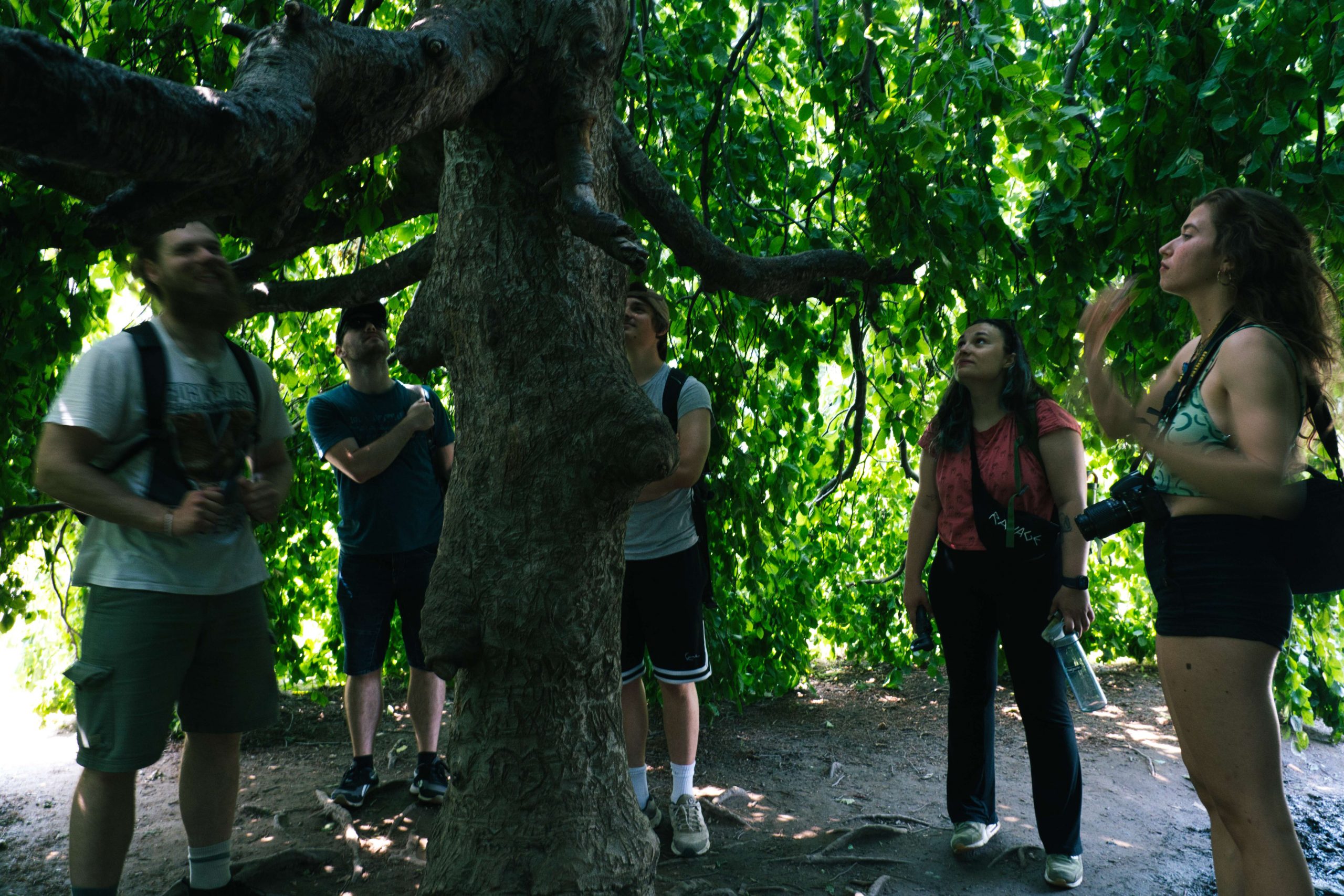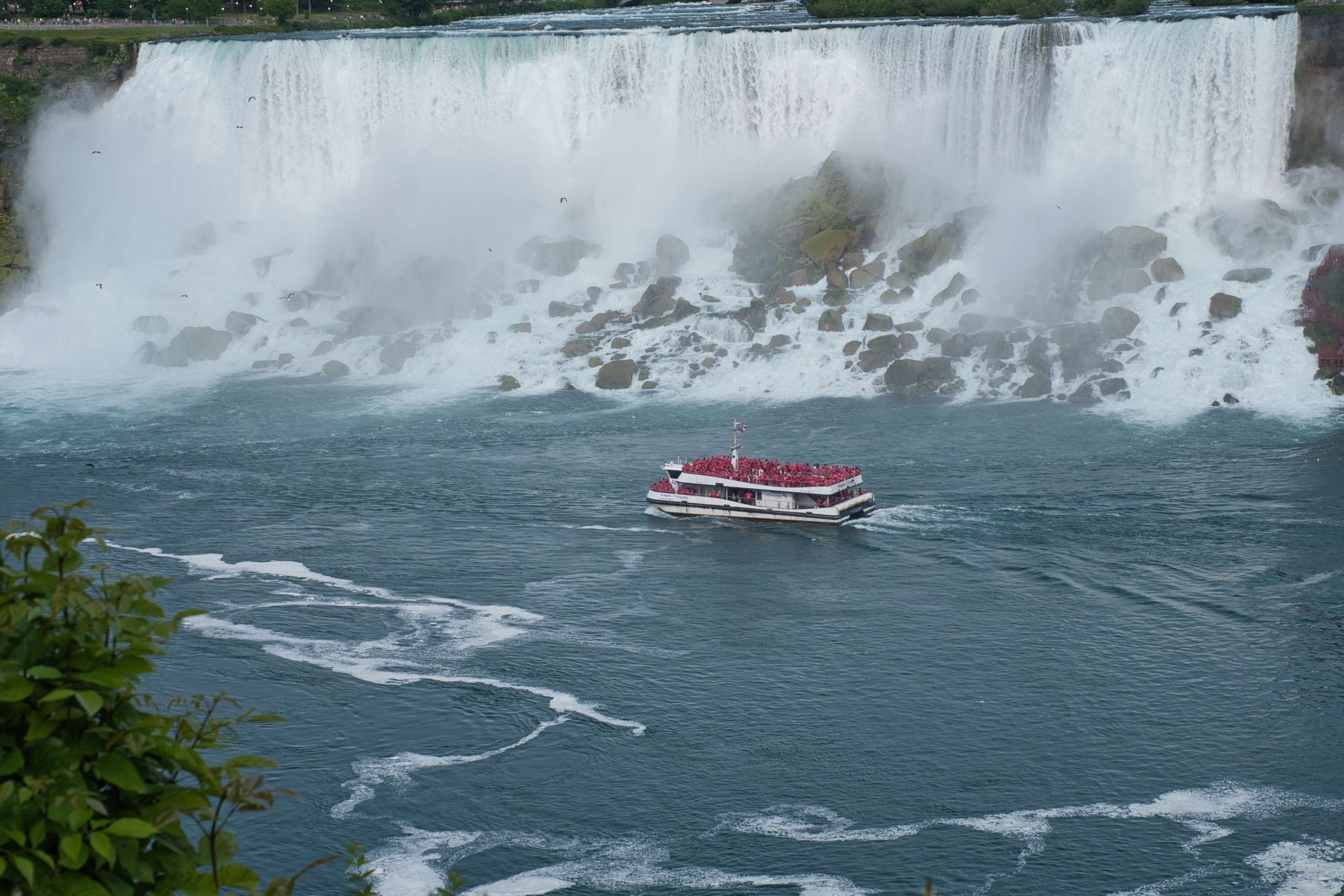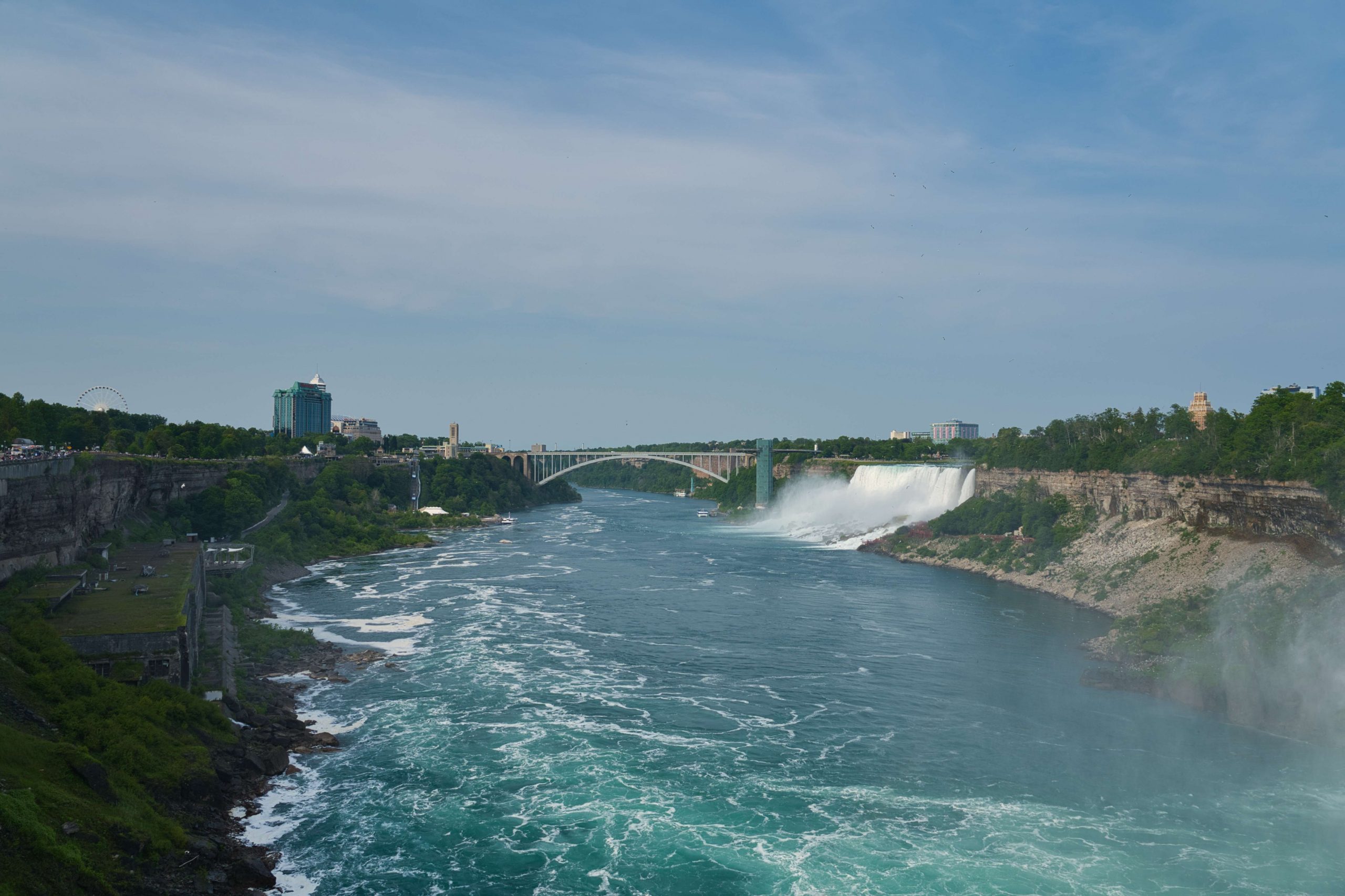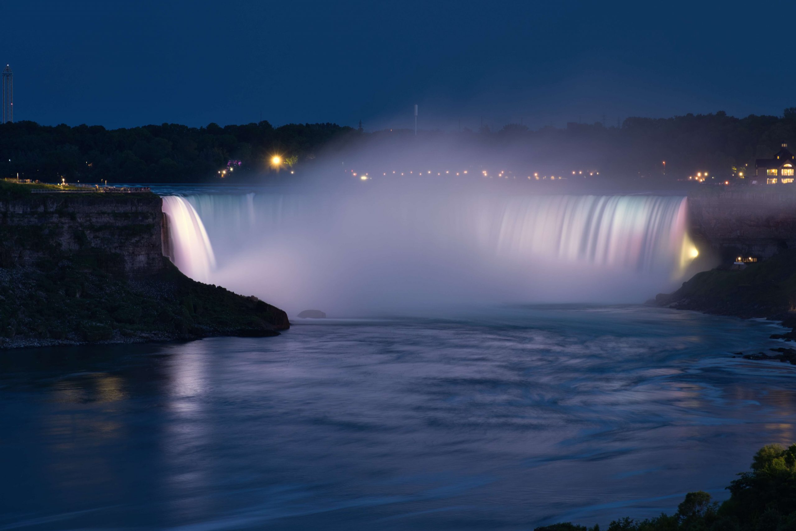 Update von Lara zum Ausflug zu den Niagara Falls: Etwa 140km von Toronto entfernt liegen die Niagara Wasserfälle. Über einen Facebook-Beitrag in einer Work and Travel Kanada Gruppe haben wir uns mit ein paar anderen Reisenden vernetzt, um zusammen einen Ausflug zu den Wasserfällen zu machen. Marshal und Manou, ein deutsches Paar, was bereits seit Oktober 2022 in Kanada unterwegs ist, haben ein großes Motorhome, mit dem wir netterweise zusammen zu den Wasserfällen hinfahren können. Jakob, der etwas außerhalb von Toronto wohnt, ist auch gerade für ein paar Monate in Kanada, um sein Englisch aufzubessern, bevor er mit dem Studieren beginnt. Und Yvan, unser Zimmernachbar, ein Franzose, der seit einem Jahr in Montréal wohnt und für ein paar Tage in Toronto ist, um ebenfalls sein Englisch aufzubessern, ist auch mit dabei. Da Marshal mit dem Motorhome nur so 75km/h fährt, damit es nicht ganz so viel Benzin schluckt, brauchen wir statt 2 knapp über 3 Stunden. Aber das ist völlig in Ordnung, denn wir sitzen ganz gemütlich hinten im Wohnmobil zwischen all dem schönen Feder- und Steinschmuck, den Manou gebastelt hat, und genießen die Aussicht. Wir parken auf einem großen Parkplatz und machen uns auf den Weg zu den Falls. Angekommen sind Malte und ich tatsächlich als erstes etwas enttäuscht und denken so „Okay, das sind also diese berühmten Wasserfälle. Haben wir uns irgendwie größer vorgestellt.“ Es sind sehr viele Tourist*innen auf dem Gehweh unterwegs und die Boote, die ganz nah an die Wasserfälle ran fahren, sind auch super voll. Alle haben Regenponchos an, auf den Booten aus der USA blaue Ponchos, auf den Booten aus Kanada rote – es wird hier also ganz deutlich gemacht, wer aus welchem Land kommt. Wir haben keine Lust viel Geld zu bezahlen, um mit einem Boot einmal kurz ranzufahren und nass zu werden. Wir spazieren also Richtung einem Wasserfall und beobachten einen Vogel dabei, wie er am Abgrund verschwindet und hoffen, dass ihm nichts passiert ist. Je weiter wir gehen, desto weniger Menschen werden es und es wird entspannter. Wir finden einen großen Baum, dessen Äste eine Höhle bilden, in die man reingehen kann und betrachten die Schnitzereien auf der Rinde. Da es irgendwann nicht mehr so richtig weitergeht, drehen wir wieder um und gehen den Weg zurück und Richtung anderem Wasserfall. Als wir langsam Hunger bekommen, holen wir uns in einem kleinen Foodcourt was zu essen. Das Essen ist hier teuer und leider gibt es nur Fast Food Kram, alles sehr touristisch aufgezogen. Danach chillen wir uns in einen Park und beobachten das Wasser. Wir wollen noch bleiben, bis es dunkel wird, weil Marshal von einer Lichtershow um 20 Uhr gelesen hat. Leider ist um 20 Uhr noch nicht wirklich was zu sehen, es ist allerdings auch noch relativ hell. Wir setzen uns auf eine Mauer und quatschen, um uns die Zeit zu vertreiben. Gegen kurz nach 21 Uhr sind dann die ersten Lichter bei den Wasserfällen zu sehen und es sieht super schön aus. Wir suchen uns einen besseren Platz zum Sehen und beobachten, wie der Wasserfall in Regenbogenfarben leuchtet (Juni ist in Nordamerika der Pride-Monat). Ganz am Ende gibt es noch ein kurzes Feuerwerk, was man sich auch hätte sparen können. Wir machen uns auf den Weg zurück und gehen dabei noch durch eine Straße mit viel leuchtender Reklame, einigen Fast Food Läden und so Spielbuden wie auf dem Rummel, bloß in größer, einem Riesenrad Adventure Mini-Golf etc. – es fühlt sich an wie Klein Las Vegas und wir sind froh, als wir da durch sind und es etwas ruhiger ist. Auf einer Wiese sehen wir noch ein paar Füchse rumlaufen und dann sind wir auch schon wieder am Wohnmobil angekommen. Mit guter Musik machen wir uns auf den Weg nach Hause und Marshal bringt uns wieder wohlbehalten zurück nach Toronto, während wir alle hinten sitzen und schlafen. Dies war ein echt super schöner Ausflug und wir sind froh, dass man auf Reisen Dinge macht, die einem zu Hause nicht mal einfallen würden. Wir verabreden uns einfach mit fremden Menschen über Facebook, steigen bei ihnen mit noch anderen fremden Menschen ins Auto und machen alle gemeinsam einen Ausflug. Wir sind eine zusammengewürfelte Truppe von Menschen, die zusammen etwas erlebt und direkt fühlt man sich verbunden, obwohl man sich nur ein paar Stunden kennt. Und genau, das ist der Grund, warum wir unterwegs sind.